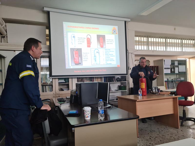 Οι ανθυποπύραγοι κύριοι Παπασίμος Αποστ. & Δαλαγιώργος Αν. παρείχαν πληροφορίες για την ασφαλή αντιμετώπιση περιστατικών πυρκαγιάς, απάντησαν σε ερωτήματα των εκπαιδευτικών και επιπλέον ανέδειξαν πρακτικά ζητήματα που κρίνονται χρήσιμα σε περιπτώσεις εκτάκτων αναγκών.