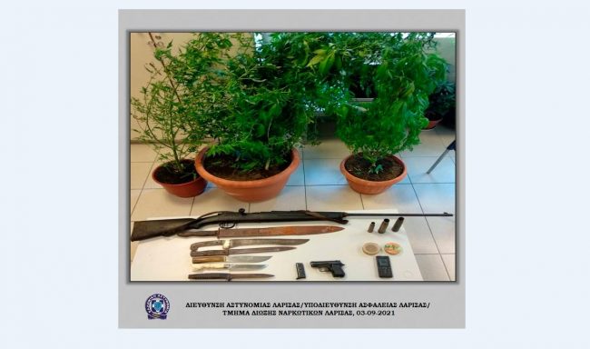 Κατασχέθηκαν, μεταξύ άλλων, -5- καλλιεργούμενα δενδρύλλια κάνναβης, -35- γραμμάρια αποξηραμένων και νωπών φύλλων κάνναβης, πλήθος αντικειμένων που εμπίπτουν στο νόμο περί όπλων και το χρηματικό ποσό των -100- ευρώ