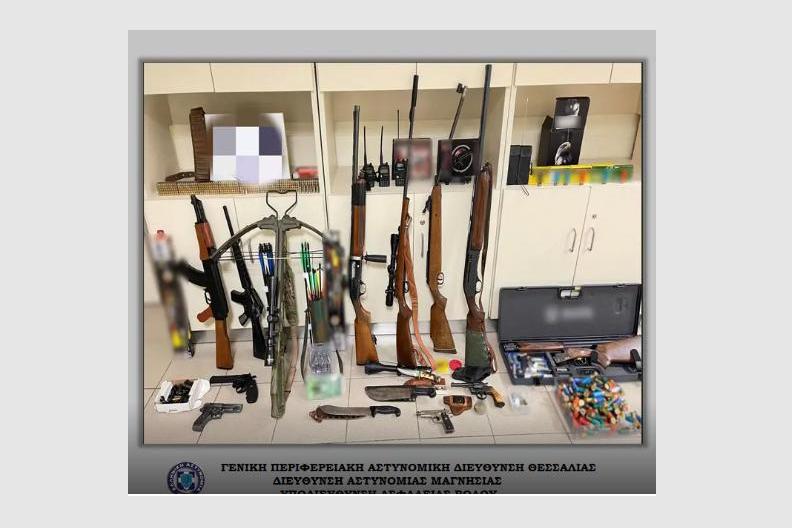 Κατασχέθηκαν, μεταξύ άλλων, -1- πιστόλι, -1- περίστροφο, 1- τυφέκιο με προσαρμοσμένη σκοπευτική διόπτρα και σιγαστήρα, -620- φυσίγγια ποικίλων τύπων και διαμετρημάτων, -1- πλαστική φαρέτρα με  -8- βέλη και -3- φορητοί ψηφιακοί πομποδέκτες