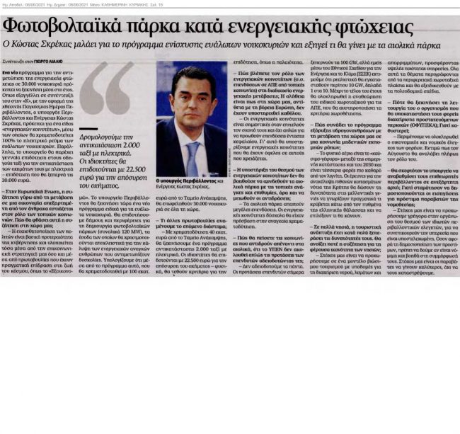 Θα επιδοτήσουμε δήμους και περιφέρειες για τη δημιουργία φωτοβολταϊκών πάρκων (συνολικά 120 MW), τα έσοδα των οποίων θα χρησιμοποιούνται αποκλειστικά για την κάλυψη των ενεργειακών αναγκών ανθρώπων που αντιμετωπίζουν δυσκολίες. Υπολογίζουμε ότι μέσα από τοπρόγραμμα αυτό, που θα χρηματοδοτηθεί με 100 εκατ. ευρώ από το Ταμείο Ανάκαμψης, θα επωφεληθούν 30.000 νοικοκυριά σε όλη τη χώρα.