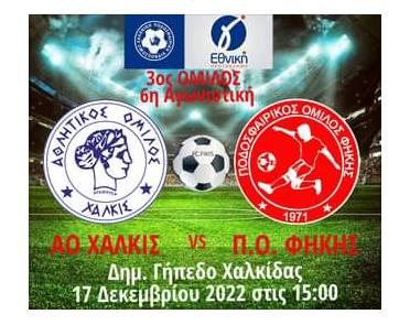 Η ομάδα μας αγωνίζεται εκτός έδρας το Σάββατο, 17/12 στις 15:00, στην Χαλκίδα, όπου θα αντιμετωπίσει τον τοπικό Α.Ο. Χαλκίς, στο δημοτικό Γήπεδο Χαλκίδας.