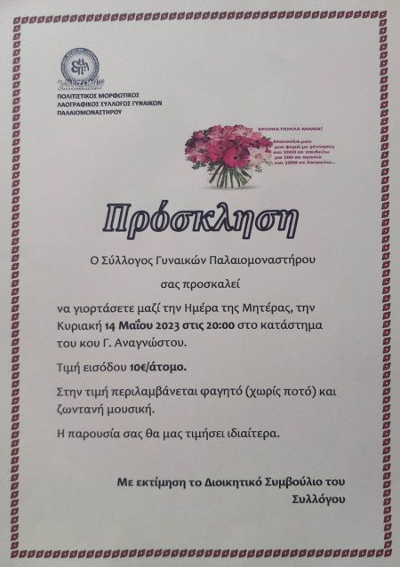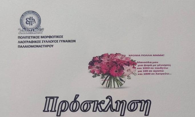 Την Κυριακή 14/5 η εκδήλωση για την γιορτή της μητέρας, από τον Σύλλογο Γυναικών Παλαιομοναστήρου