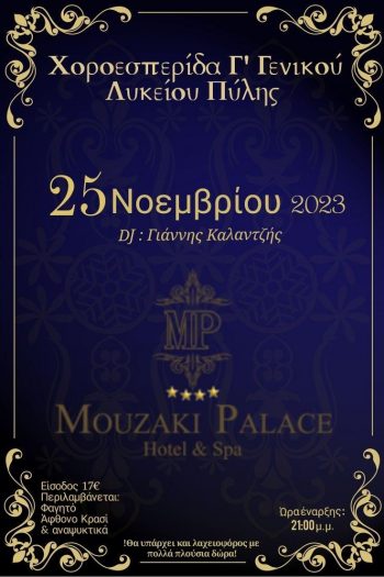 Το  προσεχές Σάββατο 25 Νοεμβρίου, οι μαθητές της  Γ’ τάξη του Γενικού Λυκείου Πύλης, διοργανώνουν τον ετήσιο ετήσιο χορό τους στο «Mouzaki Palace».