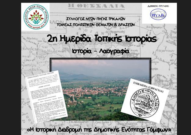 Η φετινή Ημερίδα του Συλλόγου Νέων Πηγής, θα αποτελέσει ένα ιστορικό και λαογραφικό ταξίδι στα τέως χωριά του Δ. Γόμφων (Πηγή, Παλαιομονάστηρο, Γόμφοι, Μουριά, Λυγαριά, Δροσερό), μέσα από το οποίο θα περιηγηθούμε στην ιστορία των αυτοδιοικητικών εκλογών, στα σημαντικά γεγονότα της τοπικής ιστορίας, στο πως
