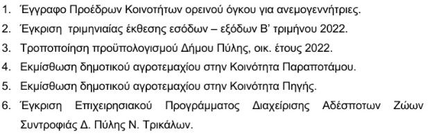 Την ερχόμενη Τετάρτη 7 Σεπτεμβρίου 2022 και ώρα 7:00μμ στην αίθουσα συνεδριάσεων στο δημ. Κατάστημα της Πύλης, θα πραγματοποιηθεί δια ζώσης & με τηλεδιάσκεψη, μέσω του συστήματος “Cisco Wbex”, η τακτική συνεδρίαση του ΔΣ Δήμου Πύλης με εννέα άρθρα ημερήσιας διάταξης, τα οποία έχουν ως εξής…: